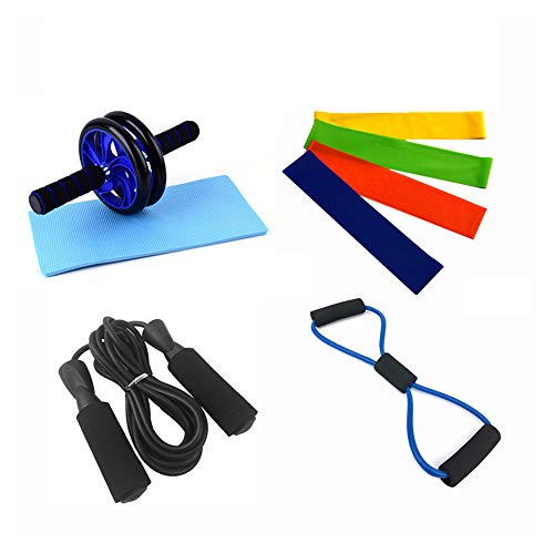 8-in-1 fitnessset, inclusief een buikrolwiel met gratis kniebeschermer, een springtouw, een 8-vormige weerstandsband en vier weerstandslussen.
