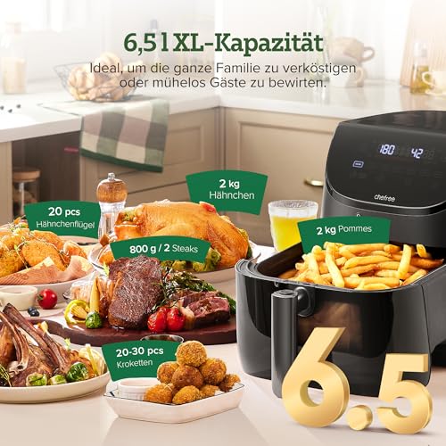 Grote capaciteit van 6,5 liter voor gezinsmaaltijden: Met zijn royale capaciteit van 6,5 liter kan deze air fryer gemakkelijk familiediners of bijeenkomsten aan, waardoor het een geweldige oplossing is voor grote huishoudens of het organiseren van feestjes.
