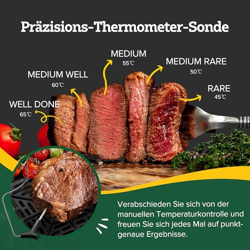 Slimme Temperatuursonde voor Perfect Koken: De Chefree AF500 heeft een ingebouwde slimme sonde die zorgt voor een nauwkeurige temperatuurregeling, zodat zelfs beginners perfect sappige steaks kunnen bereiden.