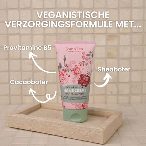 Leveringsomvang: 1 x Jean&Len handcrème pioenroos & lychee, hydrateert normale en droge handen, met provitamine B5, sheaboter en cacaoboter, veganistische handverzorging