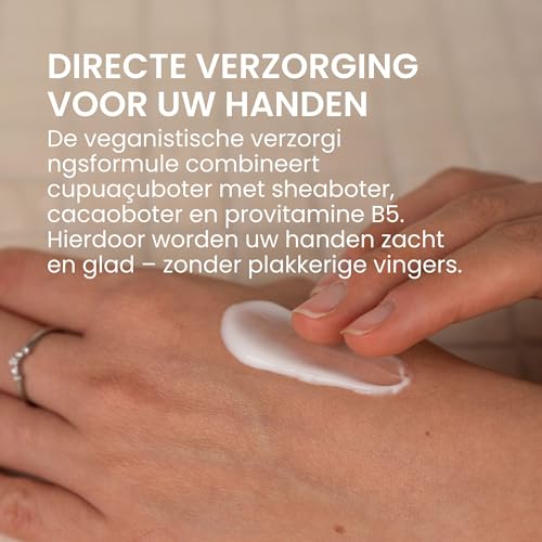 De veganistische verzorgingsformule, verrijkt met provitamine B5, sheaboter en cacaoboter, hydrateert normale en droge handen zonder te plakken
