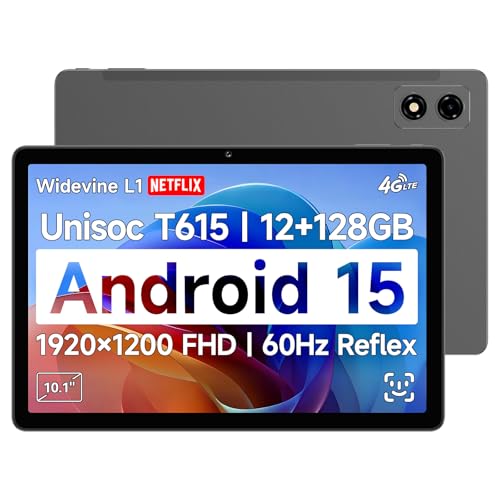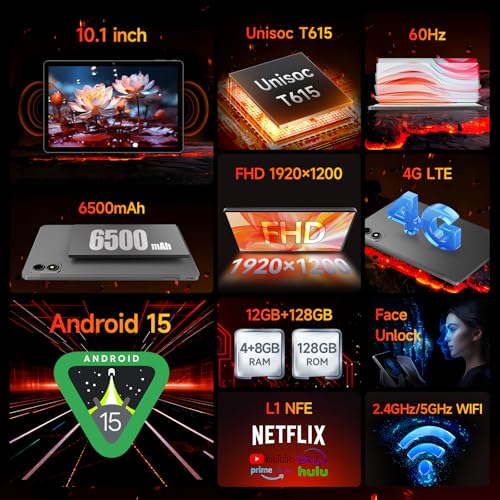 [2025 Nieuwste Android 15] 10,1 inch tablet van BNCF, FHD IPS 1920×1200 en 60Hz Reflex-scherm, Widevine L1, Unisoc T615 (8 Core), 12GB+128GB(1TB TF), 4G LTE+2.4G/5G Wifi+BT5.0+GPS, 5MP camera, 6500mAh